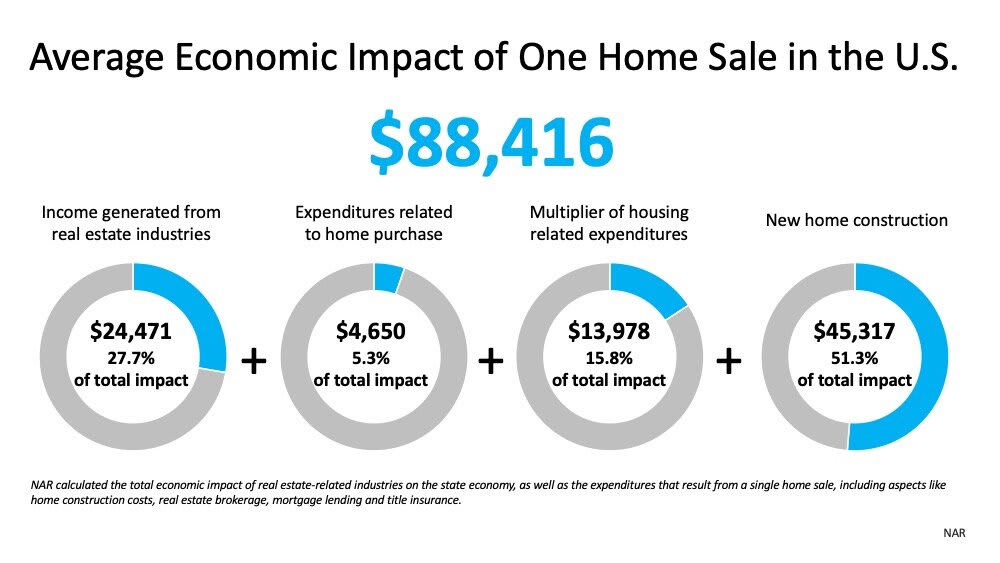 One of the big reasons why housing has the potential to be such a driving force is the significant impact it has on the local economy. This impact is particularly strong when a newly constructed home is built and sold. According to a recent study by the National Association of Realtors (NAR), the average new home sale has a total economic impact of $88,416. As outlined in the graphic below, this is a combination of income generated from real estate industries, expenditures, and new home construction.