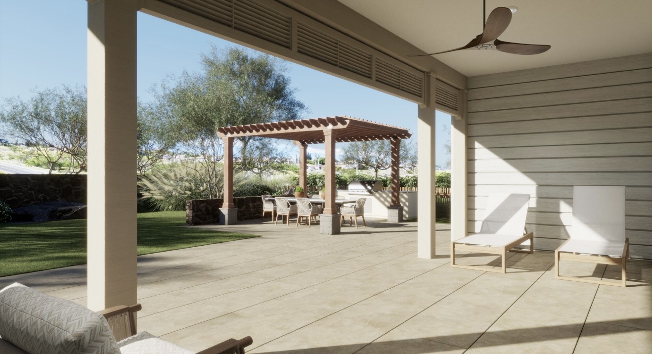 Inside, the airy single story layout flows seamlessly with 3 bedrooms 2 and one half baths, pre-construction MAILE homesites offer 3 or 4 bedroom, 3 or 4 bathrooms, or an option multi generational suite. offers fabulous flexibility The primary suite offers privacy and convenience, with wood flooring, large windows opening to the lanai, and a spa-like ensuite featuring dual sinks.