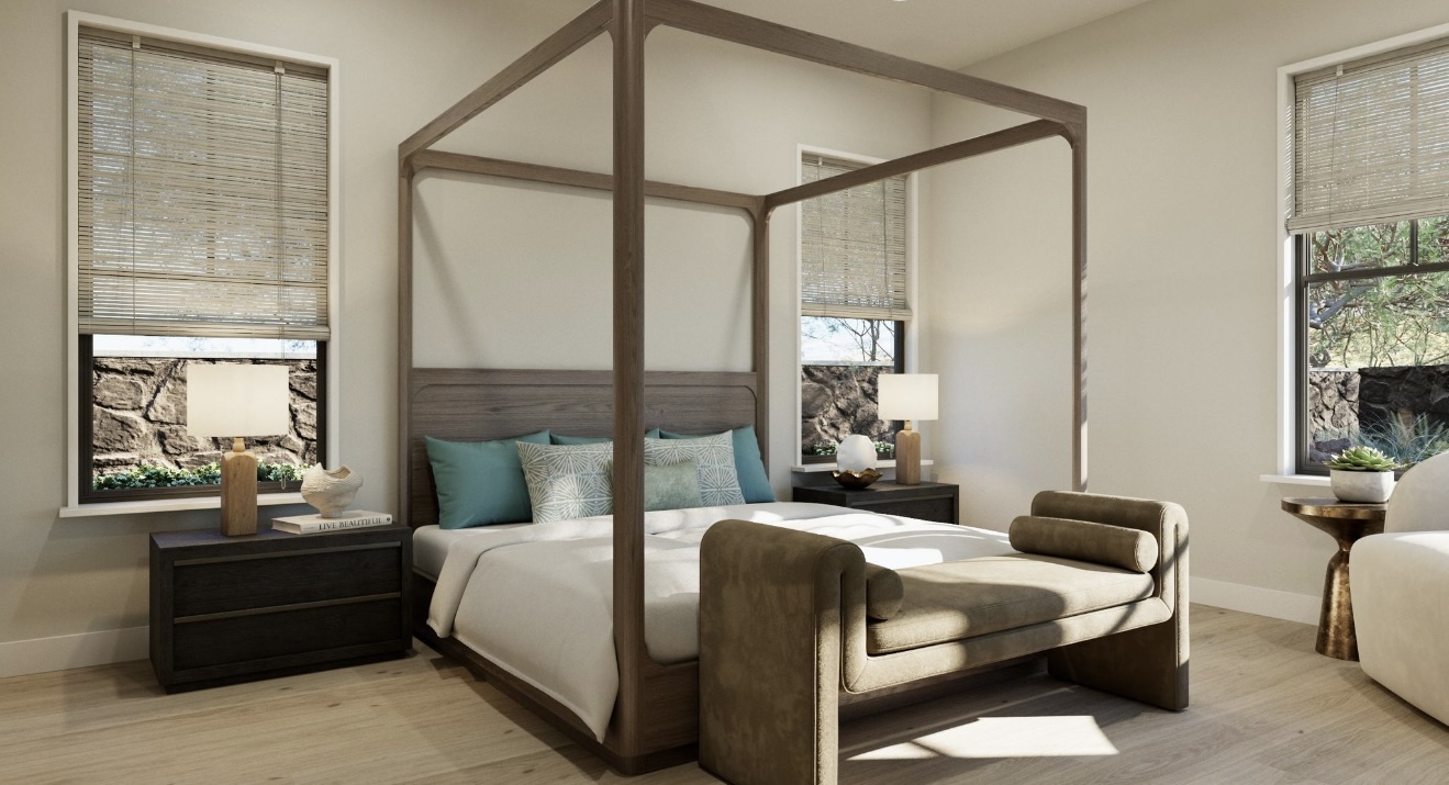 The airy interior of this single-story layout flows seamlessly with 3 bedrooms, 2 luxurious baths plus an entry guest bath. The primary suite offers privacy and convenience, with wood flooring, large windows opening to the lanai, and a spa-like ensuite bath featuring dual sinks with a generous walk in closet. The Ohi'a plan offers an optional Den/Study layout as well.
